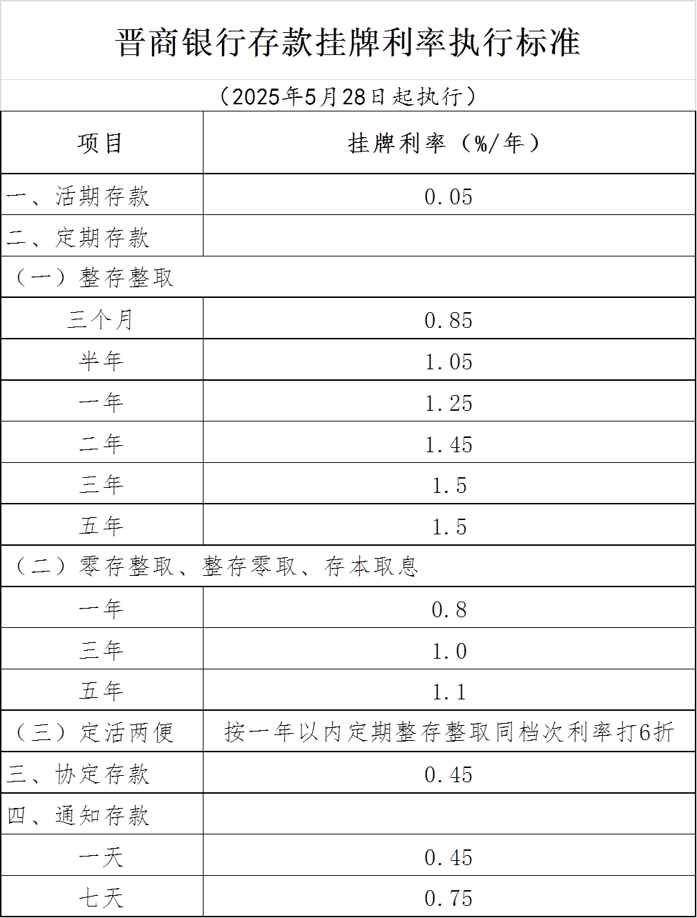 晋商银行存款挂牌利率公示(2025年5月28日)